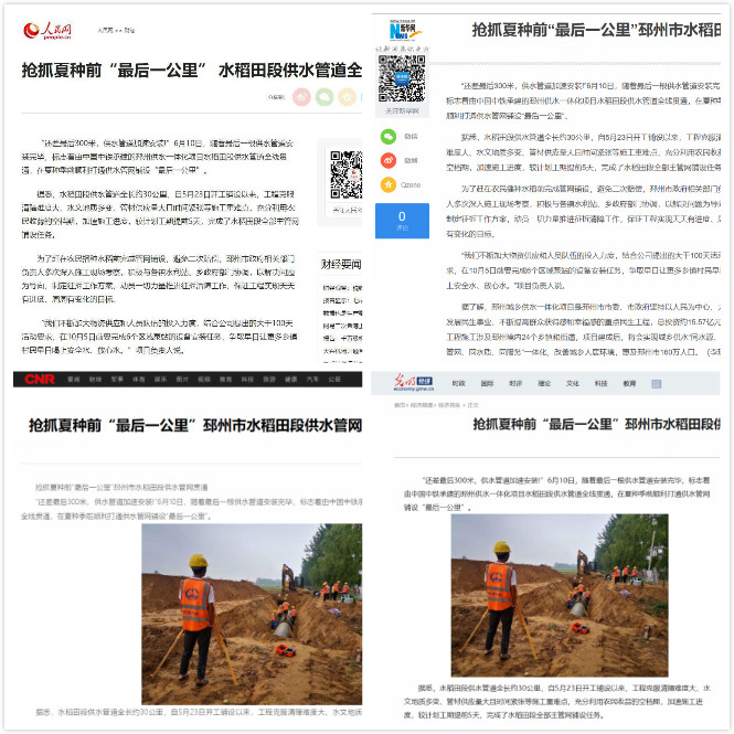 6月10日,由公司承建的邳州市供水一體化PPP項(xiàng)目水稻田段供水管道全線貫通。 邳州市供水一體化PPP項(xiàng)目水稻田段供水管道全長(zhǎng)約30公里,自5月23日開始鋪設(shè)以來,項(xiàng)目部克服清障難度大、水文地質(zhì)多變、管材供應(yīng)量大且時(shí)間緊張等施工重難點(diǎn),充分利用農(nóng)民收蒜的空檔期,加速施工進(jìn)度,1...