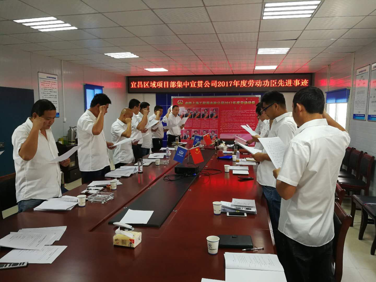 ☆4月19日,宜昌區(qū)域項目部組織干部職工宣貫公司2017年度“勞動功臣”先進事跡。宣貫會上,首先由區(qū)域項目黨總支書記向大家介紹了公司2017年度“勞動功臣”的先進模范事跡,督促各項目全體干部職工向“勞動功臣”學(xué)習(xí),弘揚敢于爭先、勇創(chuàng)一流的工作精神,營造人人學(xué)當(dāng)先進、事事爭做楷模的良好氛圍。隨后,由桔鄉(xiāng)路項目經(jīng)理領(lǐng)誓,帶領(lǐng)大家莊嚴(yán)宣讀公司誓言。最后,全體與會人員依次在簽名板上簽名,表達(dá)自己向公司“勞動功臣”努力學(xué)習(xí)并付諸實踐的決心。(馮理欽)