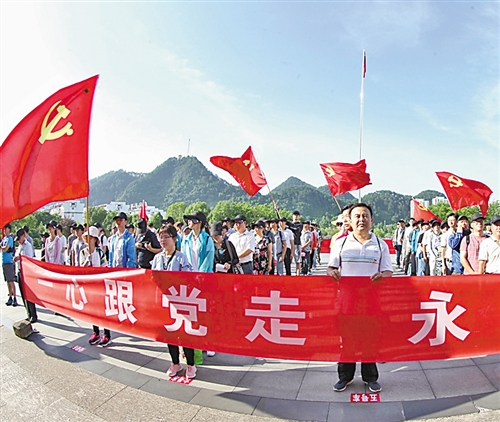 6月27日,安徽省歙縣舉辦“一心跟黨走 永遠(yuǎn)在路上”活動(dòng)迎接黨的生日。當(dāng)日,200名縣直機(jī)關(guān)黨員和非公企業(yè)的黨員從縣城出發(fā),沿著革命先烈走過的足跡,到達(dá)溪頭鎮(zhèn)汪滿田村紅軍紀(jì)念碑?;顒?dòng)中舉辦升國旗、唱國歌儀式,沿途宣傳環(huán)保、扶貧、文明創(chuàng)建等內(nèi)容。吳建平攝